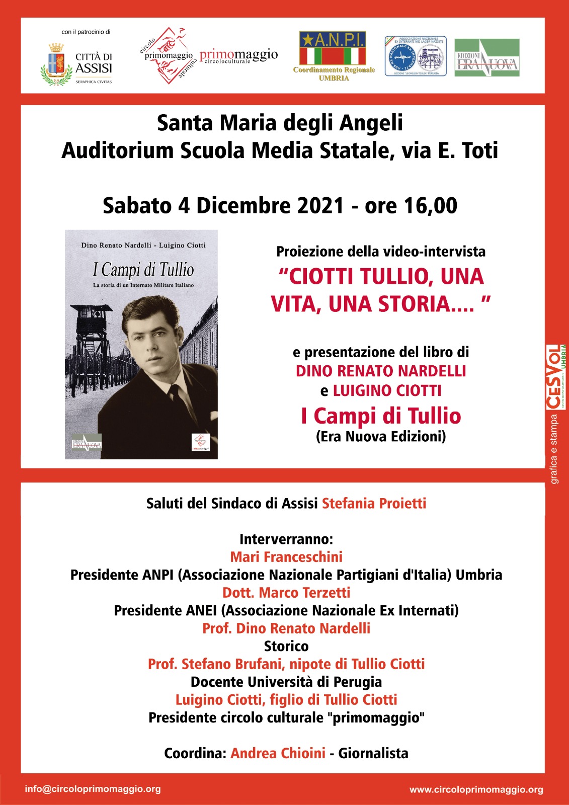 L’evento è organizzato dal circolo culturale “Primomaggio” in collaborazione con l’Anpi Umbria, con l’Anei sezione di Perugia e con il patrocinio del comune di Assisi. In occasione dell’evento verrà proiettato video-intervista “Ciotti Tullio, una vita, una storia… “.